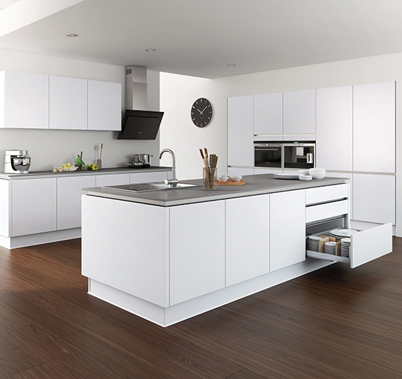 Cuisine Sans Poignee En Verre Blanc Brillant Avec Ilot